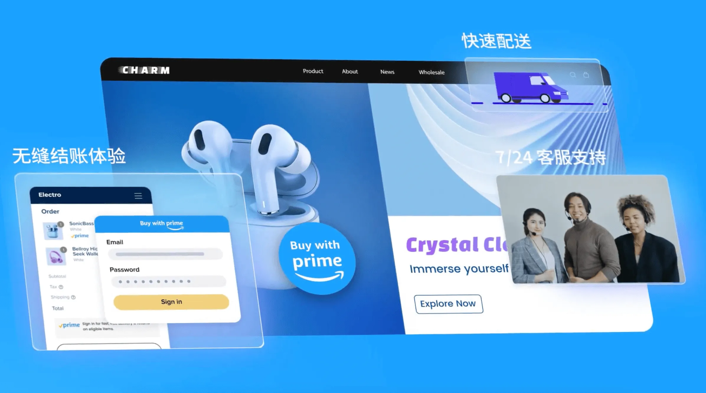 在您的 SHOPLINE 店铺中使用 Buy with Prime 接入亚马逊及时可靠的配送服务,触达亚马逊庞大的 Prime 会员客群,高效提升商店转化率,实现收入显著增长