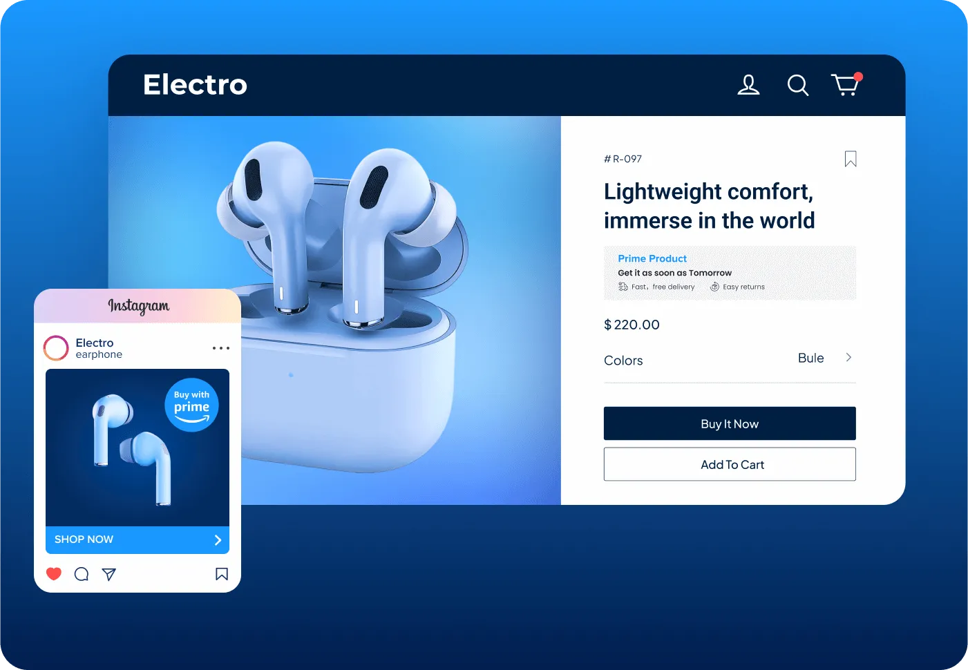 SHOPLINE 商家能够在商品详情页面、购物车和结账页等购买环节中展示 Prime 标识和会员登录入口,从而提高曝光率,促进更高的参与度和转化率。另外,若您的商店通过 Instagram,Facebook进行广告投放,Buy with Prime 标识可以作为关键字做有机搜索,用户可以搜索独立站是否具备 Buy with Prime 以提高信任度