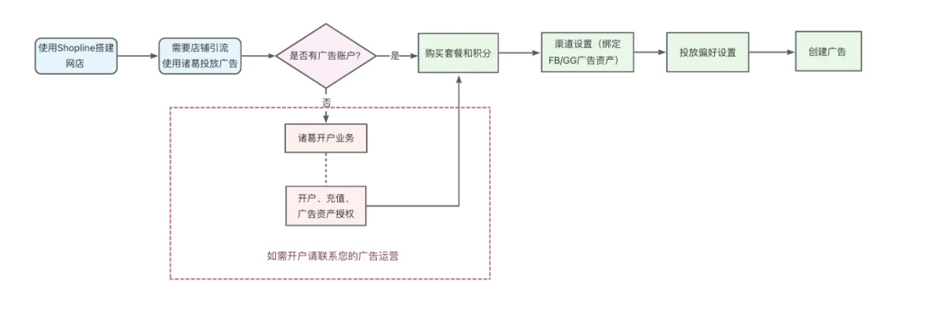 入驻SHOPLINE,购买投流营销套餐,通过SHOPLINE的诸葛广告智能投放系统,选择谷歌购物作为投放渠道。