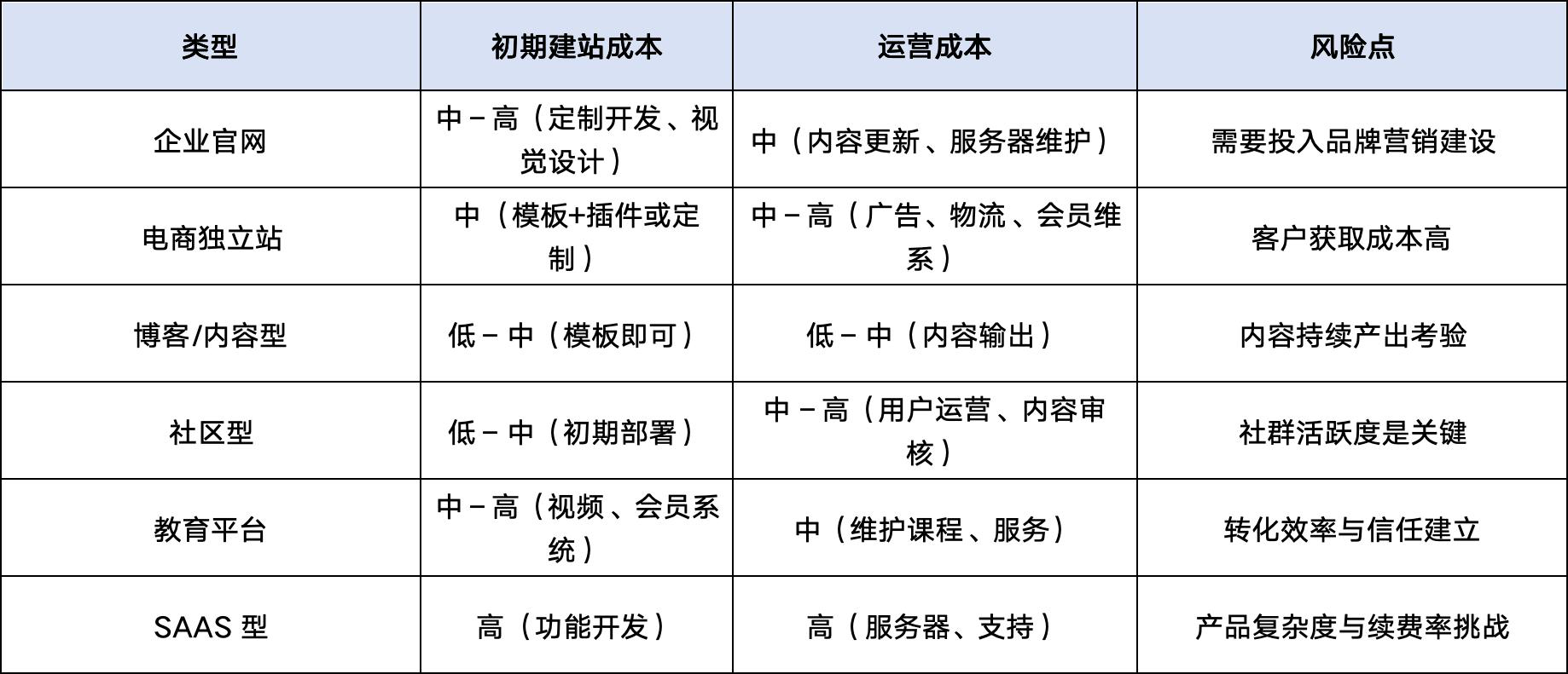 在“建站”策略中,理解不同类型网站的区别非常关键,因为它决定了你投入资源的多少、预期效果和运行模式。我们将从以下维度逐一分析:主体角度、经营模式角度、商业价值角度、成本角度、运营维度。