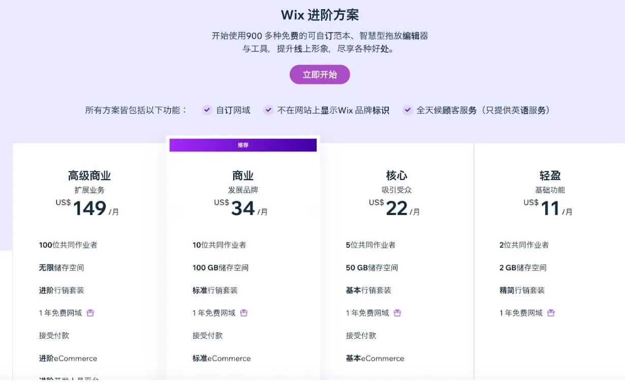 • 免费版的网站会显示 Wix 品牌广告。需要升级到付费版才能移除广告、绑定域名。