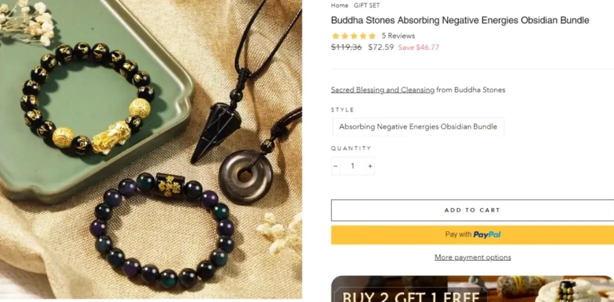 而在 Buddha Stones 的独立站上,同款产品的售价高达 72 美元,溢价超百倍。