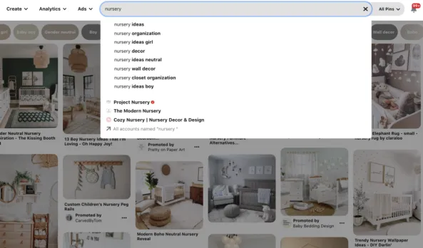 例如,如果是专门销售儿童艺术品的话,你可以设置一些热门搜索字词,例如“Nursery Ideas”和“Nursery Decor”,如果不确定搜索关键词的趋势,可以使用Pinterest的关键词研究工具来获取一些灵感。