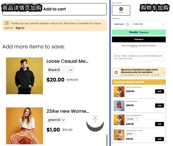 还可以通过商品推荐插件,让顾客享受一键加购的便捷体验,直接在抽屉购物车页面快速添加推荐商品,无需跳转页面,有效提升购物效率并促进订单成交。