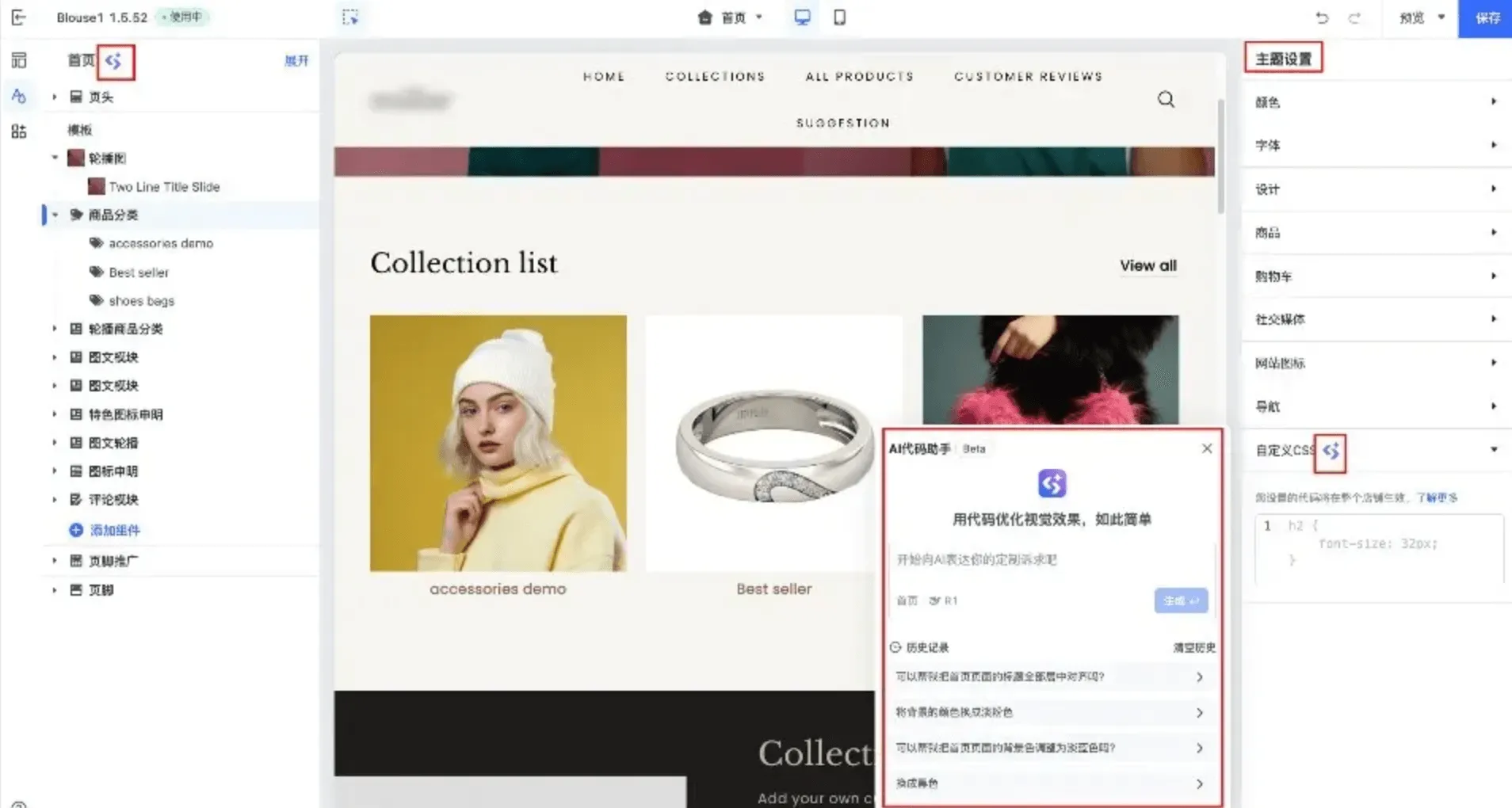 作为SHOPLINE 2025年新上线的功能,AI代码助手借助行业领先的DeepSeek大模型做“大脑”,把“代码定制”从“技术活”变成了“直觉操作”:不用学CSS、不用切工具、不用等排期,输入一句“将商品推荐组件的标题字号调大、靠左分布、颜色调整为粉色”,等待5秒即可快速生成代码,商家可以直接在编辑器里一键应用。