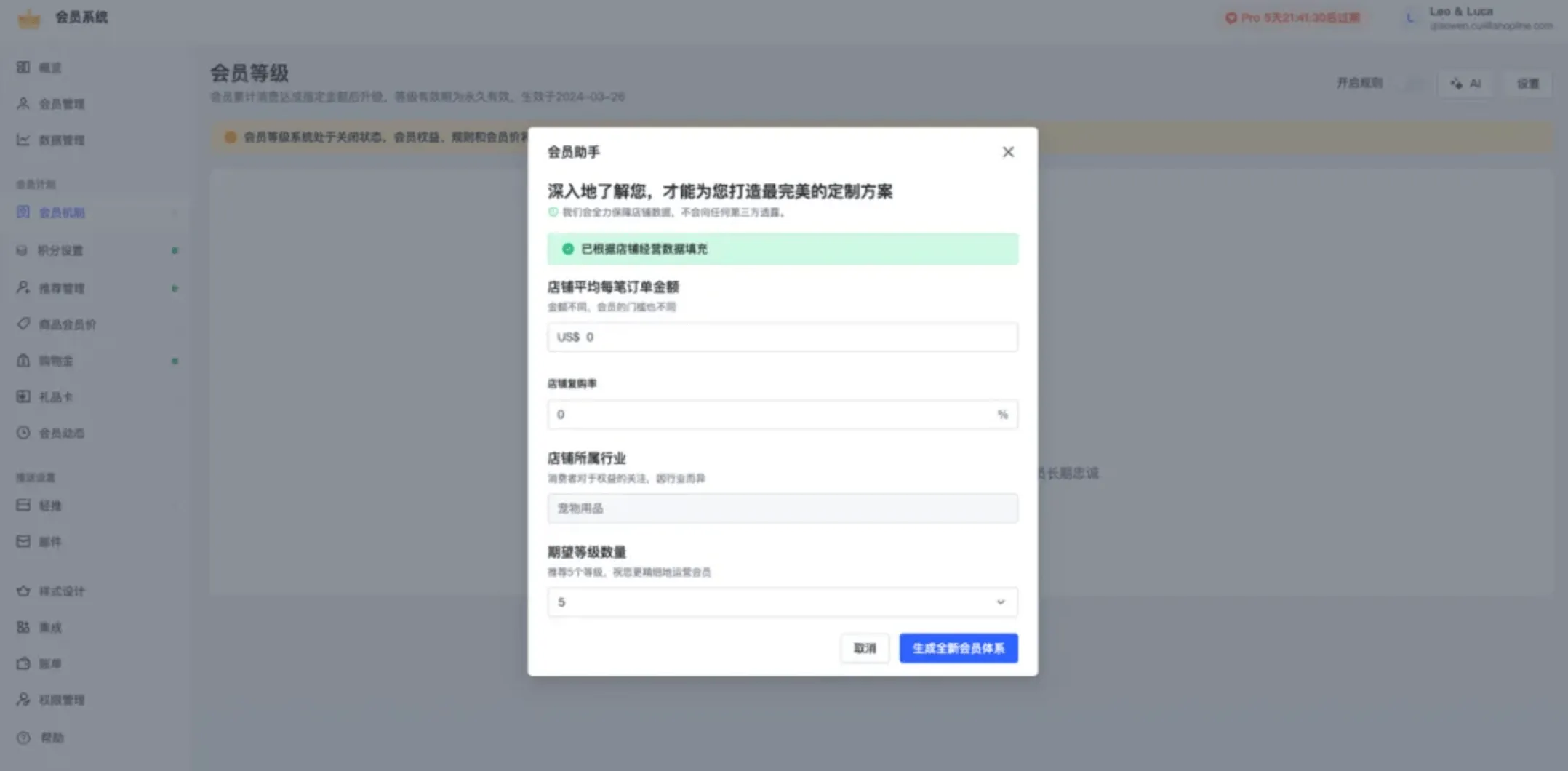 SHOPLINE的AI智能推荐定制能力,仅需商家输入基础经营数据和行业,系统直接生成‘最适合你的会员等级+权益方案’,方案不满意还可以随时一键调整。